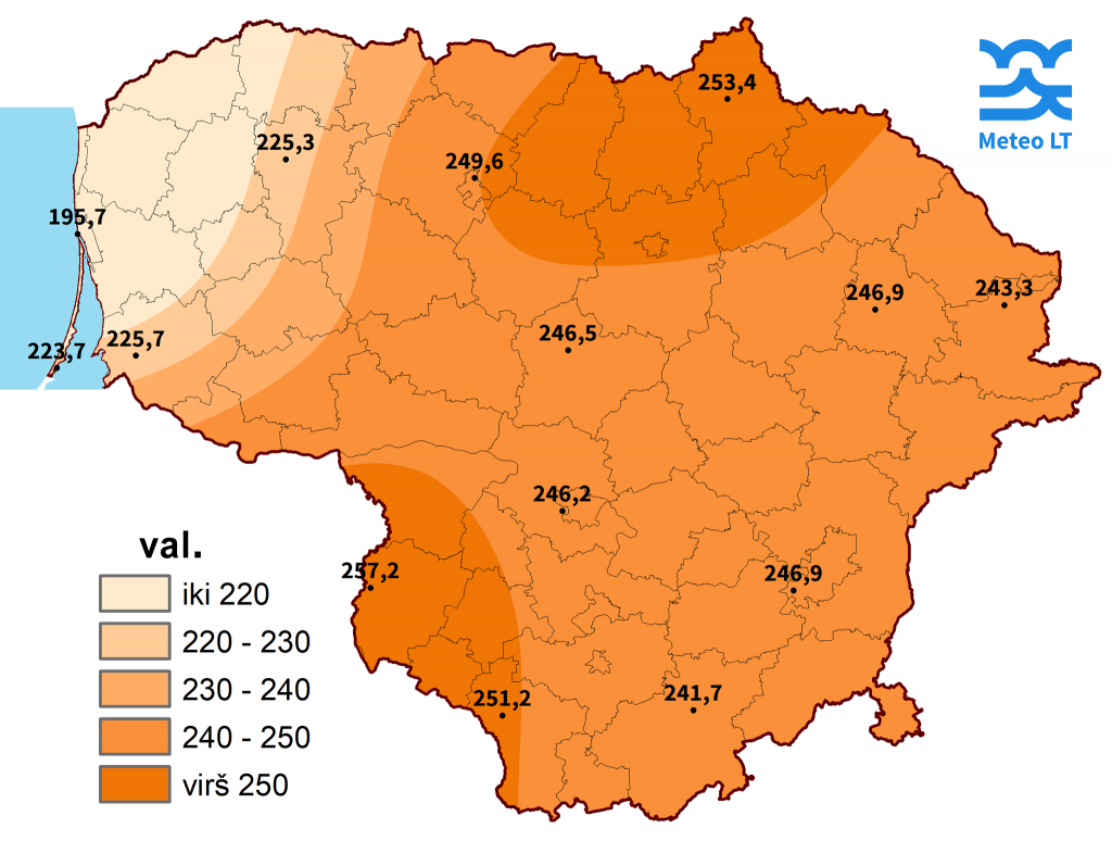 Įdomu, kad 2025 m. gegužę (232,2 val.), birželį (236,1 val.), liepą (216,6 val.) ir rugpjūtį (235,6 val.), kurie paprastai yra saulėčiausi metų mėnesiai, Saulės spindėjimo trukmė buvo šiek tiek mažesnė nei šių metų kovą.
