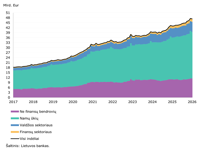 Lietuvos namų ūkių vienadieniai indėliai kredito įstaigose ir ne finansų bendrovių vienadieniai indėliai kredito įstaigose per mėnesį sumažėjo atitinkamai 674,7 mln. ir 123,8 mln. Eur, arba 3,3 ir 1,3 proc. Mėnesio pabaigoje šių sektorių vienadienių indėlių likučiai sudarė atitinkamai 19,8 mlrd. ir 9,6 mlrd. Eur. Namų ūkių sutarto termino indėliai kredito įstaigose per mėnesį sumažėjo 0,6 mln. Eur, arba 0,008 proc., o ne finansų bendrovių sutarto termino indėliai išaugo 122,8 mln. Eur, arba 7,3 proc. Šių indėlių likučiai 2026 m. sausio pabaigoje sudarė atitinkamai 7,9 mlrd. ir 1,8 mlrd. Eur;