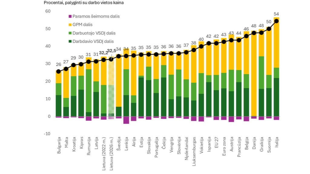 Pastaba: VSDĮ – valstybinio socialinio draudimo įmokos, paveiksle valstybės išrikiuotos pagal mokesčių pleišto dydį – nuo mažiausio iki didžiausio.