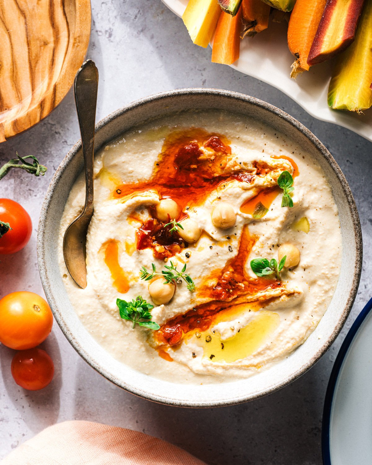 Šis pikantiškas humusas – tai klasikinis panirimas su trupučiu šilumos! Išeina itin kreminis ir tobulai pagardintas prieskoniais, puikus užkandis su daržovėmis ar pita duona. Jei norite, pridėkite aštrų garnyrą!