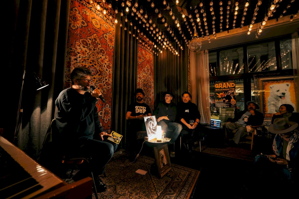 Taip dekoruotoje Vilniaus dainykloje „Estrada“ ketvirtadienio vakarą jie pristatė savo pirmąjį vinilą ir papasakojo apie šeštadienį rengiamą „Grand Balkanaktį“ – festivalį, po kurio neišvengiamai reikės poilsio dienų. (BILIETAI bilietai.lt)