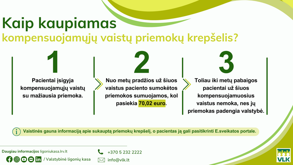 Kompensuojamųjų vaistų priemokų krepšelis kaupiamas visiems apdraustiesiems privalomuoju sveikatos draudimu nuo kiekvienų kalendorinių metų pradžios iki pabaigos. Visus metus sumuojamos priemokos, kurias apdraustas asmuo moka pirkdamas kompensuojamuosius vaistus su mažiausia priemoka. Pasiekus nustatytą ribą, priemokos už tokius vaistus iki metų pabaigos padengiamos valstybės lėšomis. Šiais metais kompensuojamųjų vaistų priemokų krepšelio riba yra 70,02 euro.