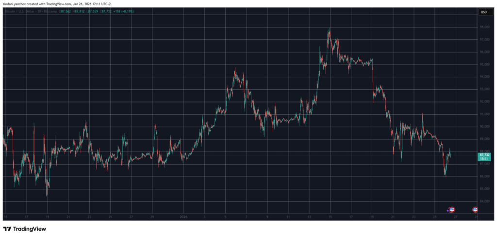 Trumpo patikinimai, kad jis nenaudos jėgos, kad perimtų Grenlandiją, lėmė pagalbos mitingą ir didesnį nepastovumą iki 91 000 USD ir sumažėjo žemiau 90 000 USD. Tačiau apskritai lokiai atrodė valdomi net per gana ramų savaitgalį, kai BTC išliko ties maždaug 89 000 USD.