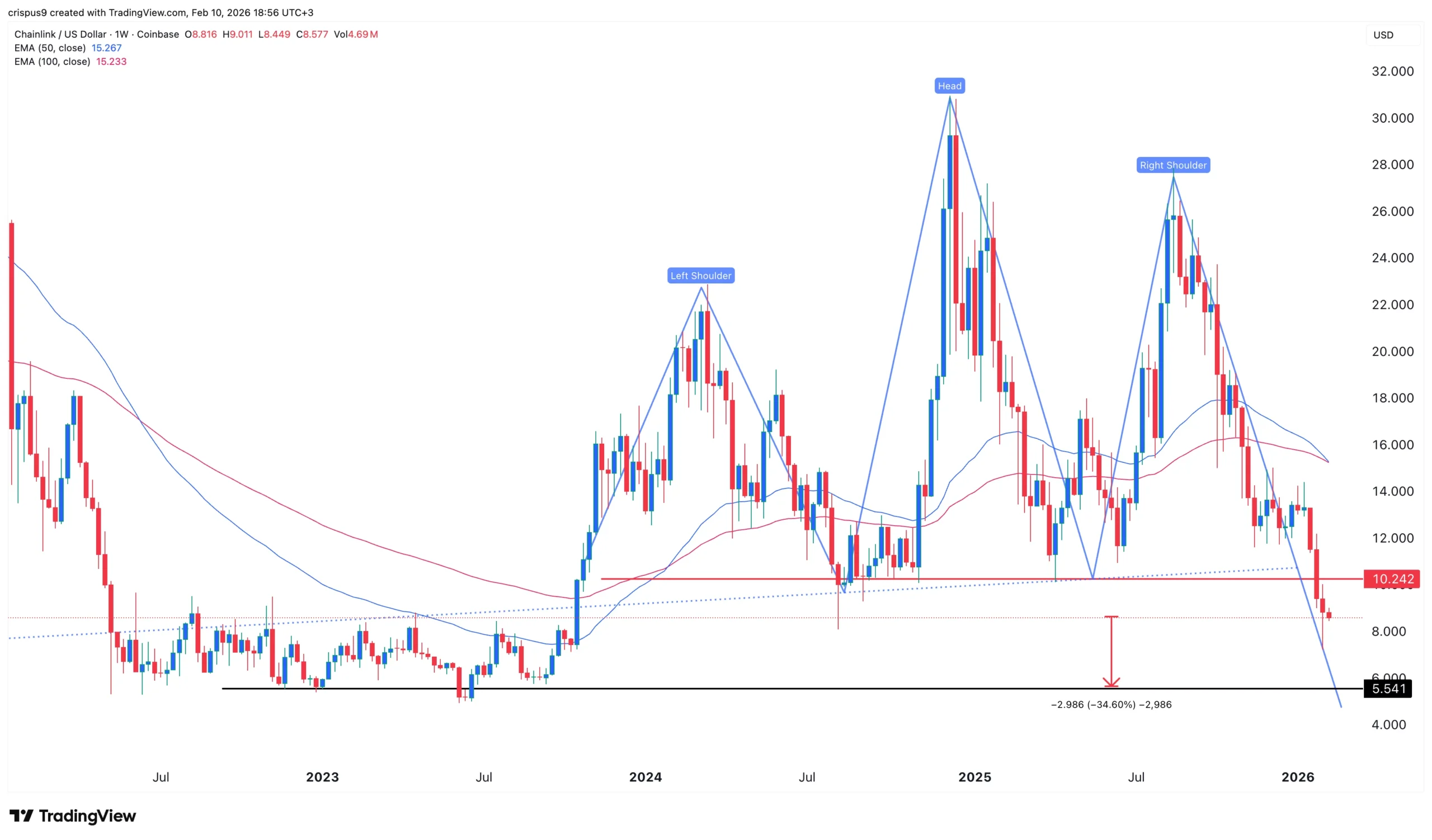 Savaitės diagrama rodo, kad LINK kaina per pastaruosius kelis mėnesius smuktelėjo nuo aukščiausios 27,46 USD rugpjūtį iki žemiausio 8,5 USD lygio.