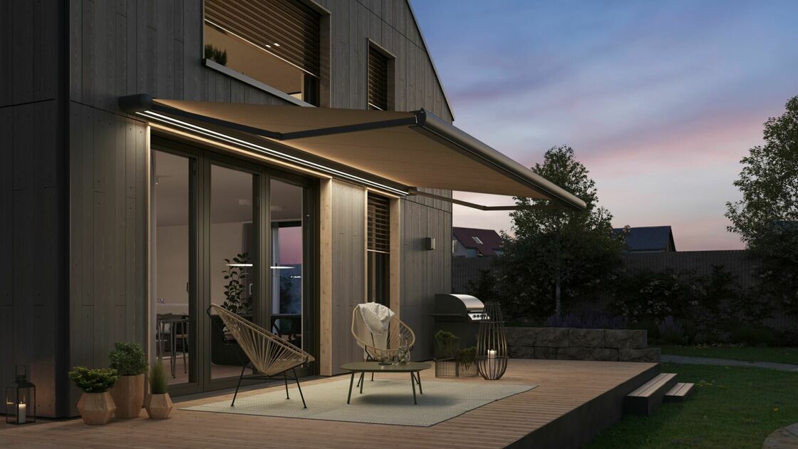 Vienas iš ryškiausių Terrea K55 išskirtinumų – integruotas apšvietimas. LED juostos įmontuotos kasetėje ir priekiniame markizės profilyje, todėl terasa gali būti apšviesta šilta ir jaukia šviesa. Šis sprendimas leidžia sukurti malonią atmosferą vakarais, kai terasa tampa vieta poilsiui, vakarienei ar susitikimams su šeima ir draugais. Integruotas LED apšvietimas veikia net ir tada, kai markizė yra suskleista, todėl lauko erdvė išlieka funkcionali ir patraukli bet kuriuo paros metu.