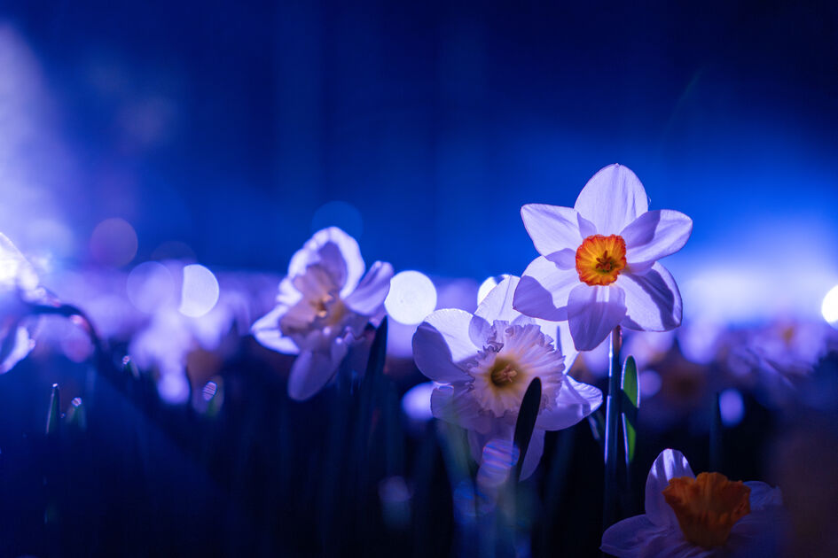 Vakaro magija: šviesa ir muzika narcizų jūroje