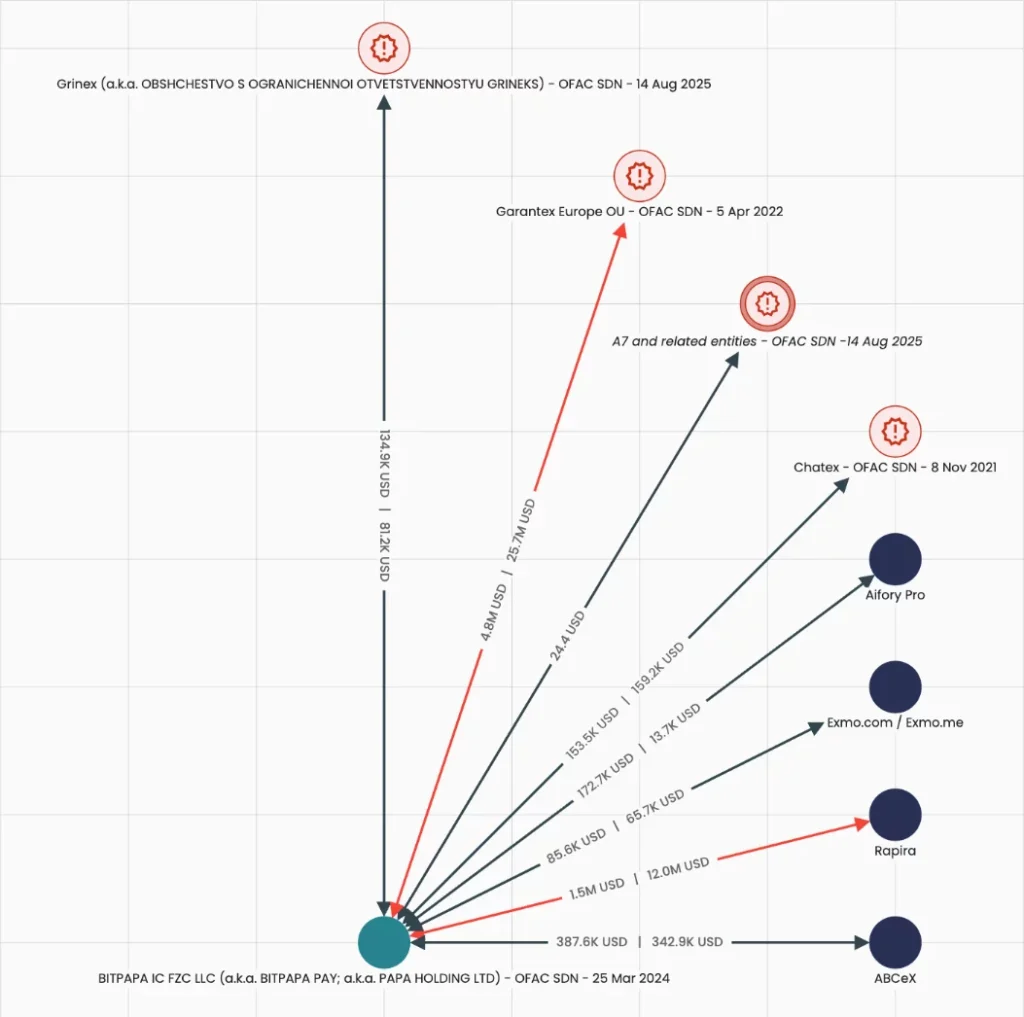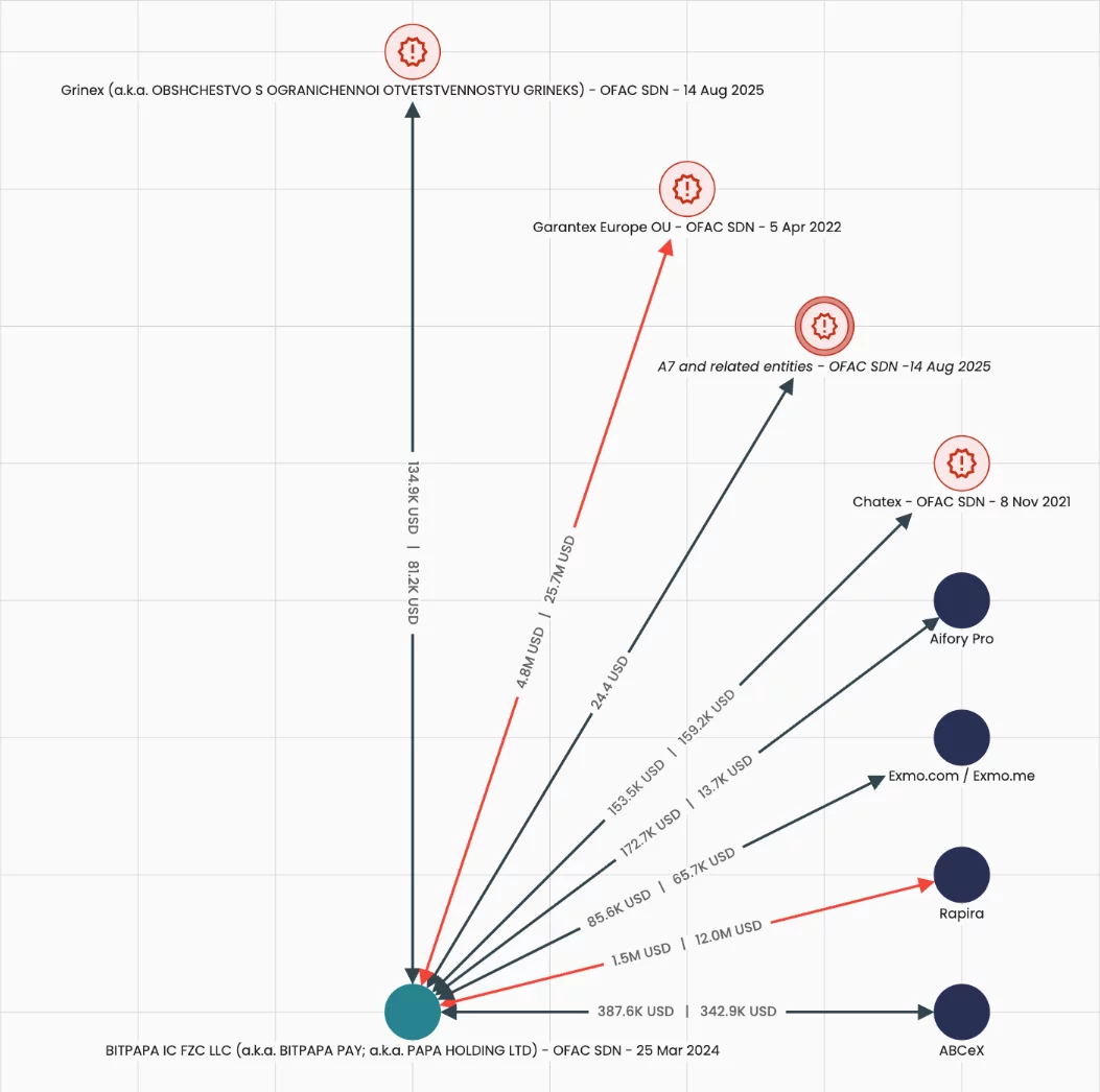 „Bitpapa“, kuriai 2024 m. kovo mėn. sankcionavo JAV Užsienio turto kontrolės biuras, maždaug 9,7% siunčiamų kriptovaliutų lėšų siunčia OFAC sankcionuotiems tikslams, įskaitant 5% sankcionuotai biržai „Garantex“.