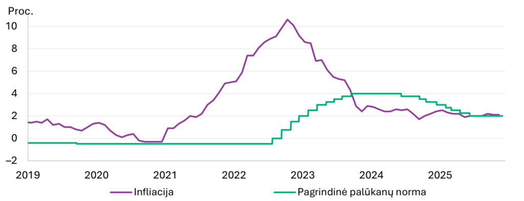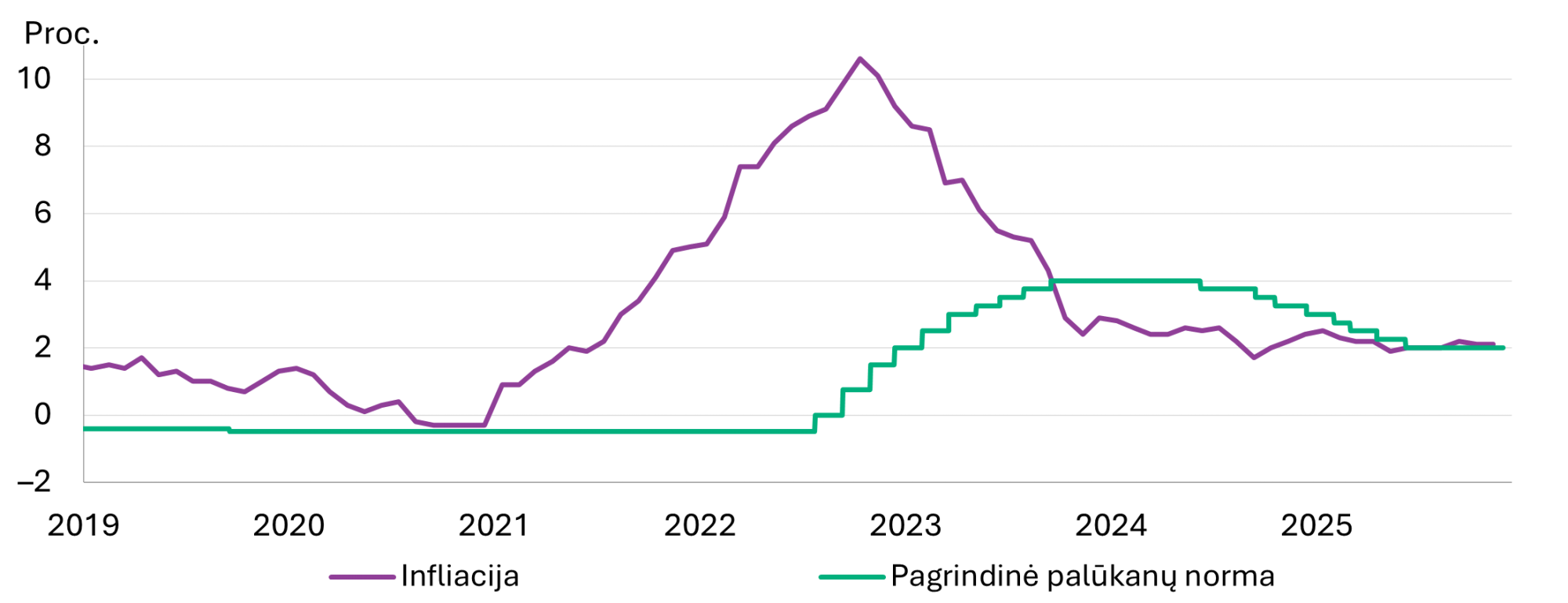 Išblėsus prekybos įtampai ir tikintis naujo postūmio iš gynybos finansavimo, euro zonos ekonomikos perspektyvos pagerėjo. Po kelerių metų pinigų politikos griežtinimo, siekiant suvaldyti po pandemijos kilusį infliacijos šuolį, 2025 m. žymi Europos Centrinio Banko (ECB) siekį normalizuoti pinigų politiką. Pirmąją metų pusę ECB sumažino pagrindinę indėlių galimybės palūkanų normą nuo 3 iki 2 proc., o nuo birželio mėn. nebekeitė palūkanų normų. Infliacijai priartėjus prie siekiamo 2 proc. lygio, pasiektas palūkanų normų lygis leidžia tikėtis, kad, esant dabartiniam veiksnių balansui, infliacija vidutiniu laikotarpiu bus ties pinigų politikos tikslu.