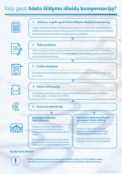 Dėl būsto šildymo, karšto ir geriamojo vandens išlaidų kompensacijų skyrimo galima kreiptis elektroniniu būdu per Socialinės paramos šeimai informacinę sistemą (SPIS) www.spis.lt arba tiesiogiai atvykus į gyvenamosios vietos savivaldybę.