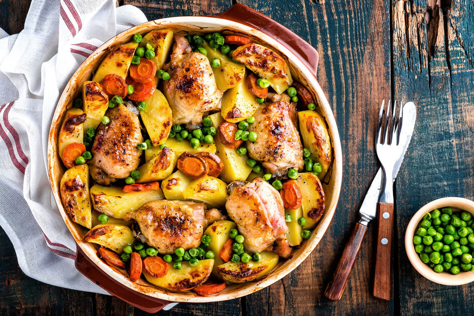 Traškios orkaitėje keptos bulvės, ryškūs žirneliai ir gaivus žolelių jogurto padažas – patiekalas, kuris tinka ir kaip garnyras, ir kaip savarankiškas lengvas pietų ar vakarienės pasirinkimas.