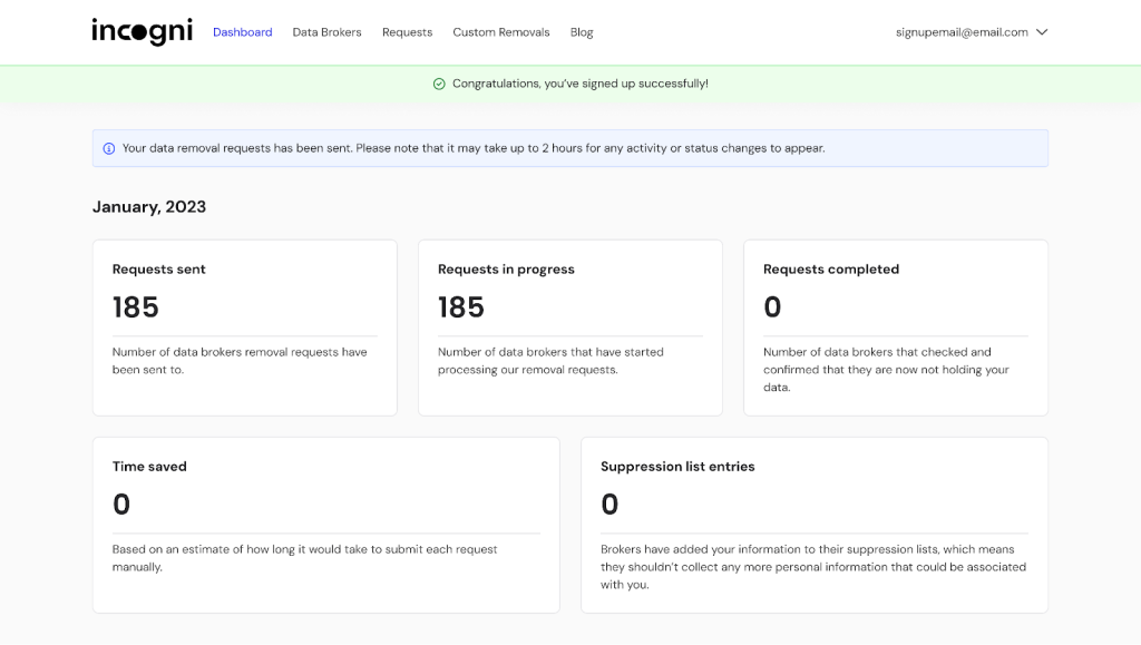 Incogni suteikia a aiškus prietaisų skydelis su užklausų žurnalais ir jų būsenomis galite sekti, bet neprivalote, kad sistema veiktų efektyviai.