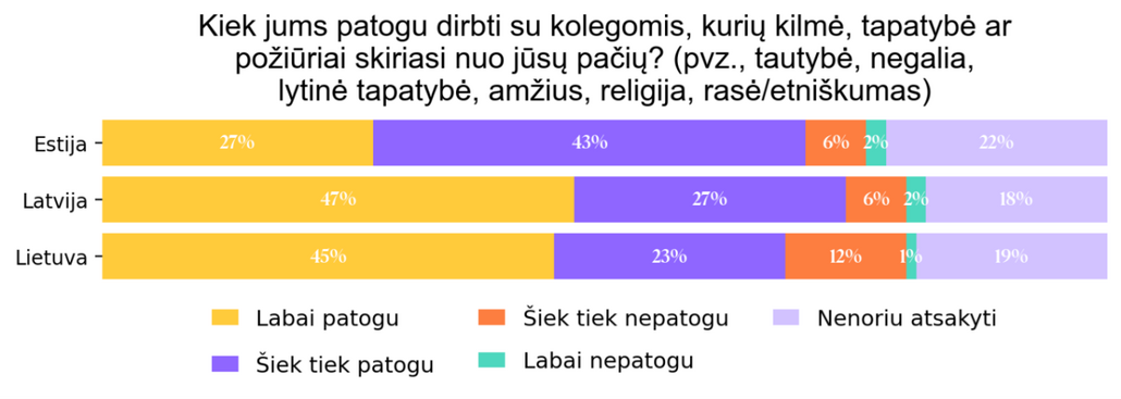 Lietuvoje, palyginti su Latvija ir Estija, kiek didesnė dalis darbuotojų nurodė jaučiantys nepatogumą dirbdami su kolegomis, kurių kilmė, tapatybė ar pažiūros, pvz., tautybė, negalia, lytinė tapatybė, amžius, religija, rasė/etniškumas skiriasi nuo jų pačių.