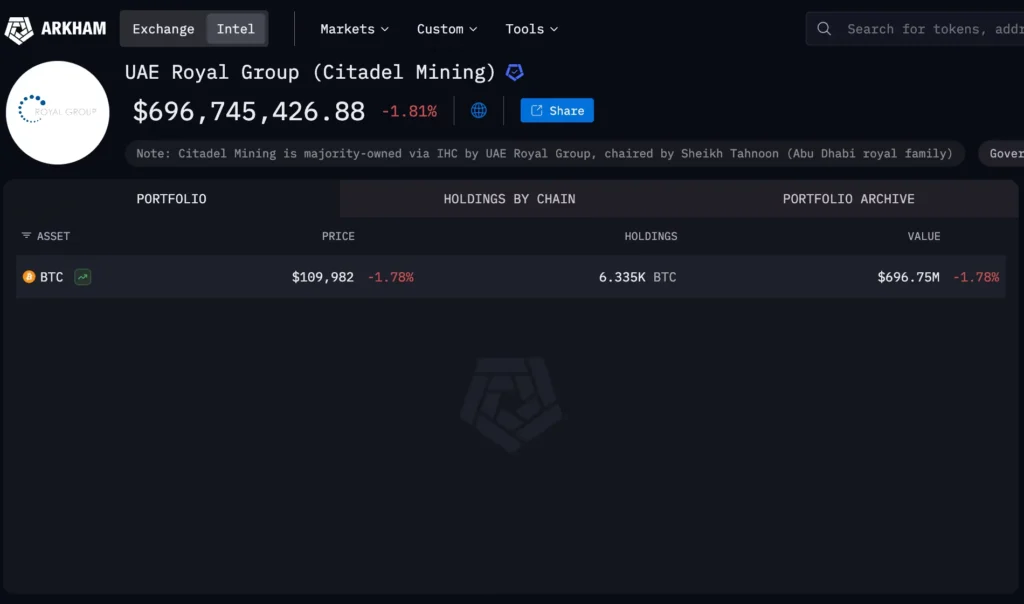 Palydoviniai vaizdai, patvirtinti grandinės duomenimis, rodo, kad „Citadel“ kasybos kompleksas Abu Dabyje buvo pastatytas 2022 m. bendradarbiaujant su „Phoenix Group“. Arkhamo ataskaitoje teigiama, kad šis požiūris derinamas su platesnėmis naftos turtingos šalies pastangomis diversifikuoti skaitmeninių finansų ir blokų grandinės infrastruktūrą.