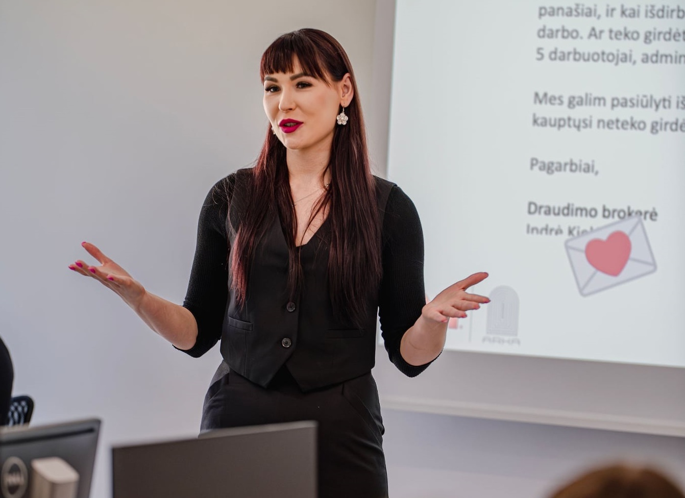 „Kalbos sėkmę matuoju ne aplodismentais. Jei po pranešimo žmonės registruojasi, perka ar keičia sprendimus, vadinasi, kalba buvo gera“, – sako V. Burdulytė. Būtent tokio kalbėjimo ji ir moko.