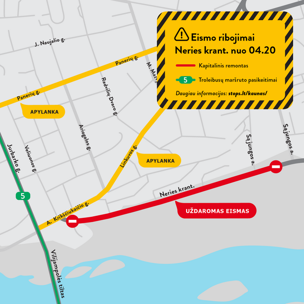 Vykstant darbams bus ribojamas eismas. Laikinai pasiekti miesto centrą važiuojant Neries krantine nepavyks, tad vairuotojai raginami rinktis apylankas Linkuvos, Panerių ir Varnių gatvėmis.