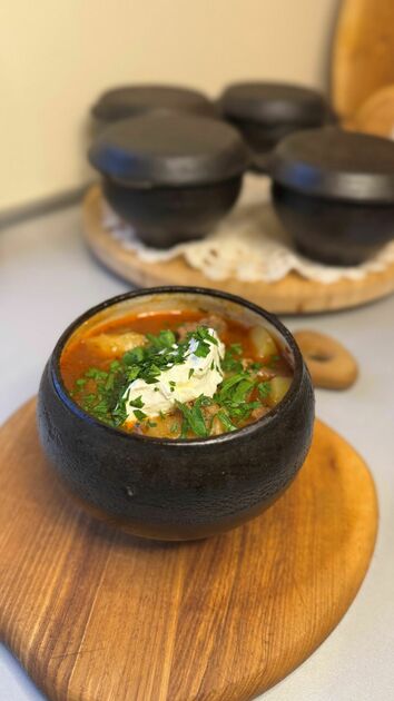 Ant troškinimo indo dugno sudėkite lauro lapus, juodųjų pipirų grūdelius, morkas, bulves, porą, aptepkite pomidorų pasta, suberkite džiovintus baravykus, sudėkite apkepintą kiaulienos sprandinę ir traiškytą česnaką. Pabarstykite druska, juodaisiais pipirais, saldžiąja paprika, baziliku, čiobreliais ir rozmarinu. Ant viršaus užpilkite kiaulienos sultinį arba vandenį, uždenkite dangčiu ir 200 laipsnių temperatūros orkaitėje troškinkite 1–1,5 val. Patiekite su grietine, apibarstę šviežiomis petražolėmis. Skanaus!