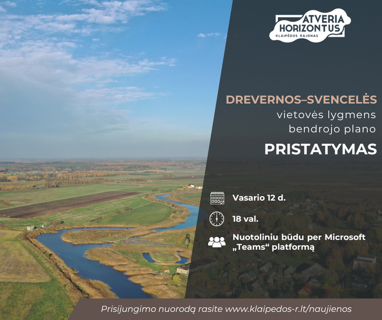 Klaipėdos rajone pastebimas augantis poreikis planuotam ir strateginiam teritorijų vystymuisi. Rengiamas Drevernos-Svencelės teritorijos vietovės lygmens bendrasis planas, kurio urbanistinės idėjos bus pristatytos viešo nuotolinio susitikimo metu šį ketvirtadienį, vasario 12 d., 18 val.