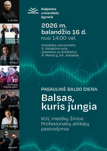 Klaipėdos universiteto ligoninė ir Klaipėdos universitetas kviečia paminėti Pasaulinę balso dieną. Balandžio 16 dieną nuo 14 val. Klaipėdos universiteto mokslininkai ir KUL gydytojai otorinolaringologai kviečia į renginį „Balsas, kuris jungia“, vyksiantį Klaipėdos universiteto S. Vaitekūno auloje (H. Manto g. 84, Klaipėda).