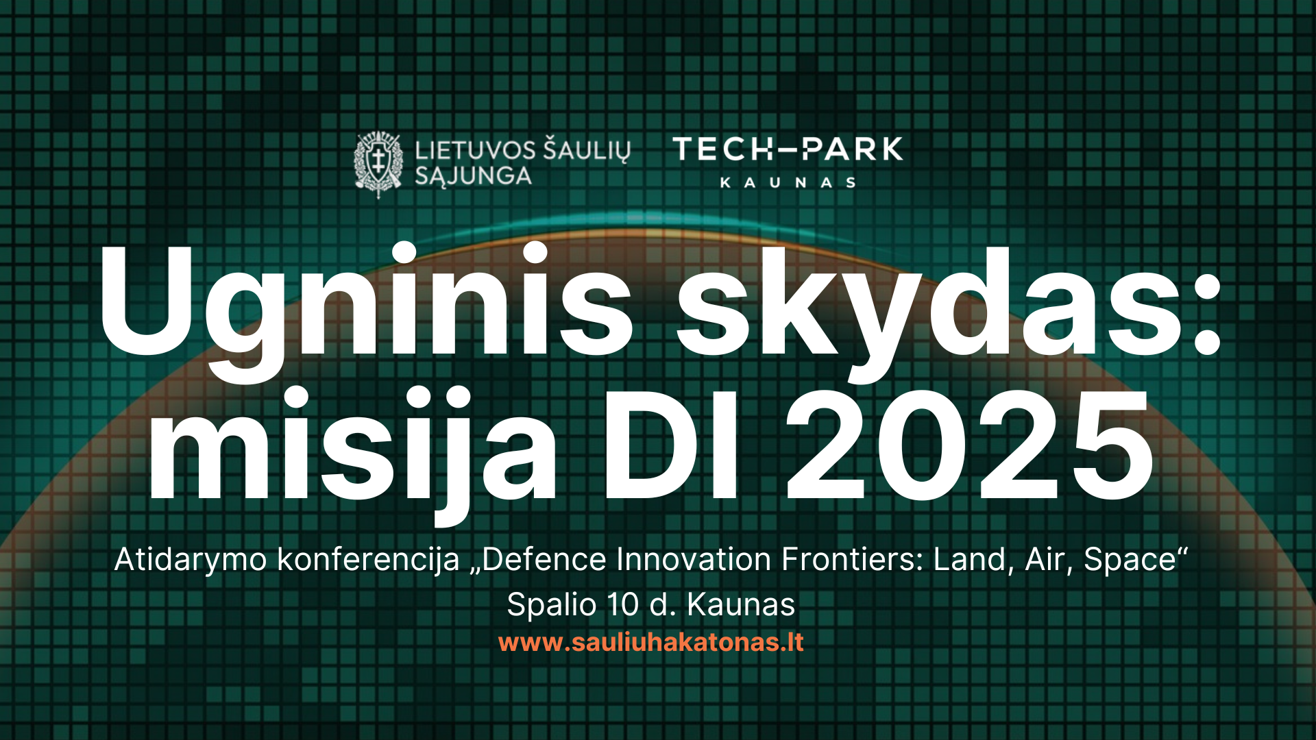 Kviečiame Jus dalyvauti Lietuvos šaulių sąjungos ir Tech-Park Kaunas organizuojamo renginio „Ugninis skydas: misija DI 2025“ atidarymo konferencijoje „Gynybos inovacijų sienos: žemė, oras, erdvė“. Konferencija vyksspalio 10 d. 17-21 val. Vytauto Didžiojo karo muziejuje (K. Donelaičio g. 64, Kaunas).