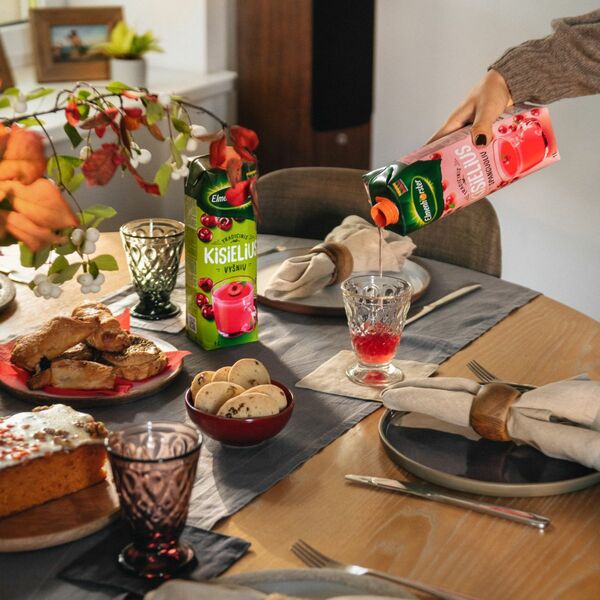 „Itin dabar populiarūs taurėse ar stiklinėse sluoksniuoti desertai. Jie ne tik papuošia stalą, bet ir apsaugo nuo persivalgymo. Be to, juos paprasta patiekti, kai kiekvienas gauna jam skirtą porciją. Pavyzdžiui, galima pasidaryti itin lengvą sluoksniuotą desertą, sluoksniuojant natūralų jogurtą su paruoštu vartoti „Elmenhorster“ kisieliumi bei įvairiomis uogomis. Toks desertas ne tik gražiai atrodo, bet yra ir itin malonaus skonio“, – pataria R. Šniolienė.
