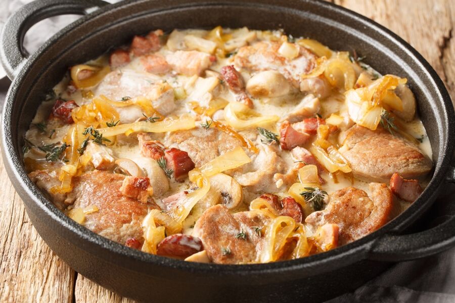 Savaitgalio pietų pažiba: keptuvėje kepta kiaulienos mentė su pievagrybiais ir svogūnų laiškais