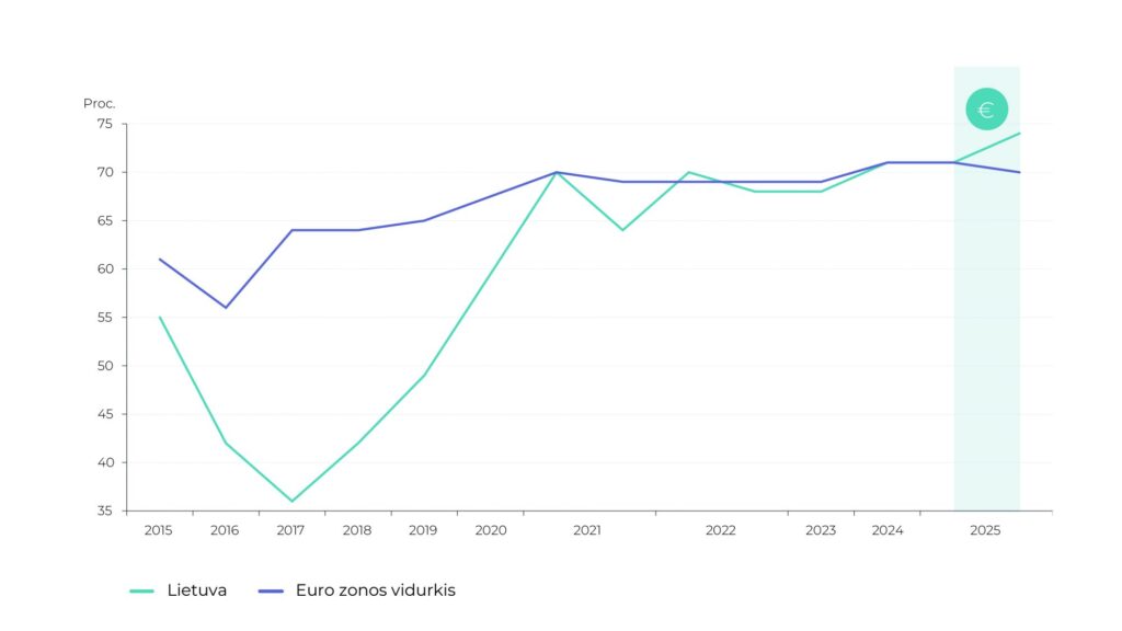 Tačiau nuo 2017 m. lietuvių pasitikėjimas euru daugiau nei padvigubėjo. Euro zonos mastu palankumas eurui nuo 2017 m. išaugo 6 proc. punktais, o Lietuvoje – net 38 proc. punktais. Tiesa, 2021 m. lietuvių pasitenkinimas euru kiek sumažėjo (tikėtina, dėl prasidėjusio kainų augimo šoko), bet vėliau palankumas eurui nuolat augo. O 2025 m. rudenį netgi aplenkėme euro zonos vidurkį.