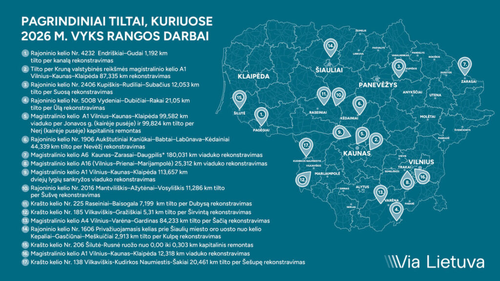 „2026-ieji – tiltų tvarkymo metai. Tiltai ir viadukai nėra tik atskiri infrastruktūros objektai – jie sudaro visos šalies kelių sistemos stuburą ir turi tiesioginę įtaką eismo saugumui, regionų pasiekiamumui bei nacionaliniam saugumui. Delsimas kainuoja per brangiai, todėl nuosekliai investuodami į tiltų ir viadukų atnaujinimą mes ne tik šaliname dešimtmečiais kauptas problemas, bet ir kuriame patikimą bei saugią infrastruktūrą ateities kartoms“, – pabrėžia „Via Lietuva“ vadovas Martynas Gedaminskas.