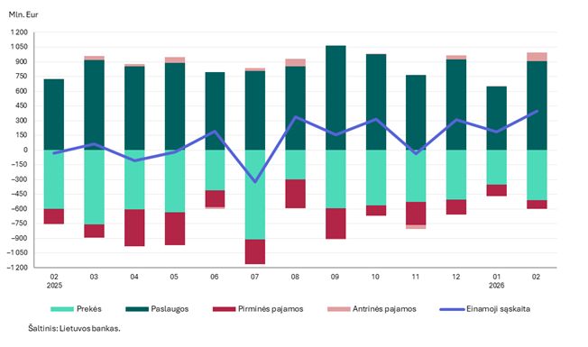Šiandien Lietuvos bankas paskelbė 2026 m. vasario mėn. mokėjimų balanso duomenis, jie rodo, kad: