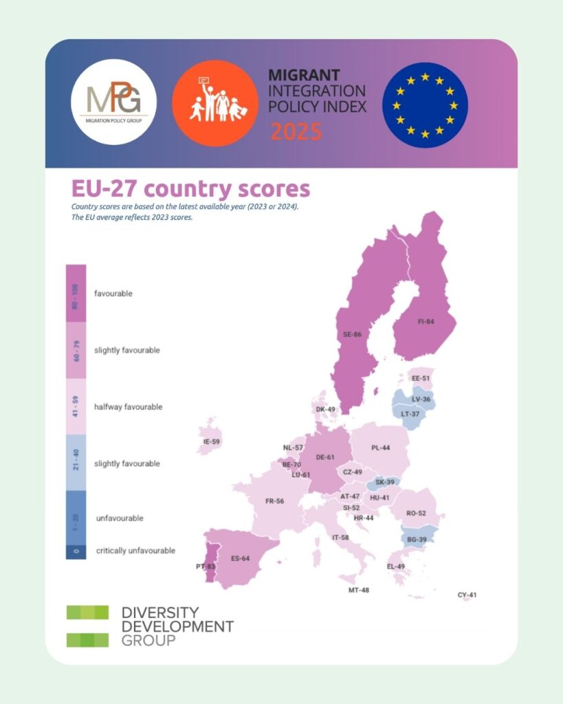 Šiandienas Migracijos Politos Grupė (MPG) Paskelbė Migrantų Integracijos Politos Indekso (Mipex 2025) Rezultatus, Atskleidžiančius Bendrą SąStingį Europos Sąjungoje. „Sšlieka skirtumas“ tarp senųjų ir naJJųjų es valsybių narių: Bendras es Vidurkis Siekia 54 TAIKKUS IS 100 – Pirmauja Švedija, SUOMIJA IR Portugalija, O Po 2004 m. į Es įSTOJUSIOS ŠALYS Reikšmingai ATSilieka (44 TAIKKAI, PALYGINTI SU 63 SENOSIOSE VALSTYBėSE NARėSE). Silpniaia Politos Sritis sšlieka politinis dalyvavimas – tik 37 TAIKKAI ISH 100.