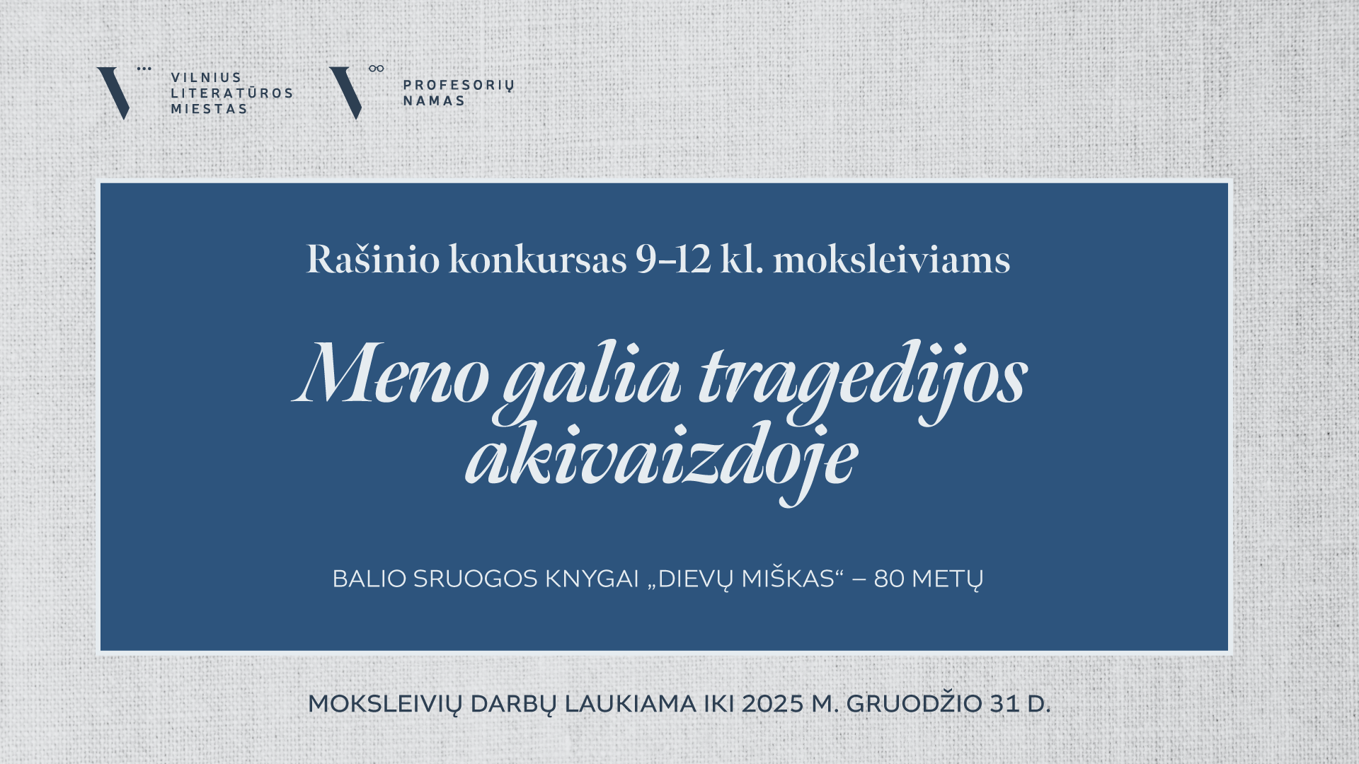 VšĮ „Vilnius, UNESCO literatūros miestas“ ir įstaigos padalinys „Profesorių namas“ kviečia 9–12 klasių moksleivius dalyvauti rašinių konkurse „Meno galia tragedijos akivaizdoje“, skirtame 80-osioms rašytojo Balio Sruogos kūrinio „Dievų miškas“ parašymo metinėms. Mokinių darbų laukiama iki 2025 m. gruodžio 31 d.