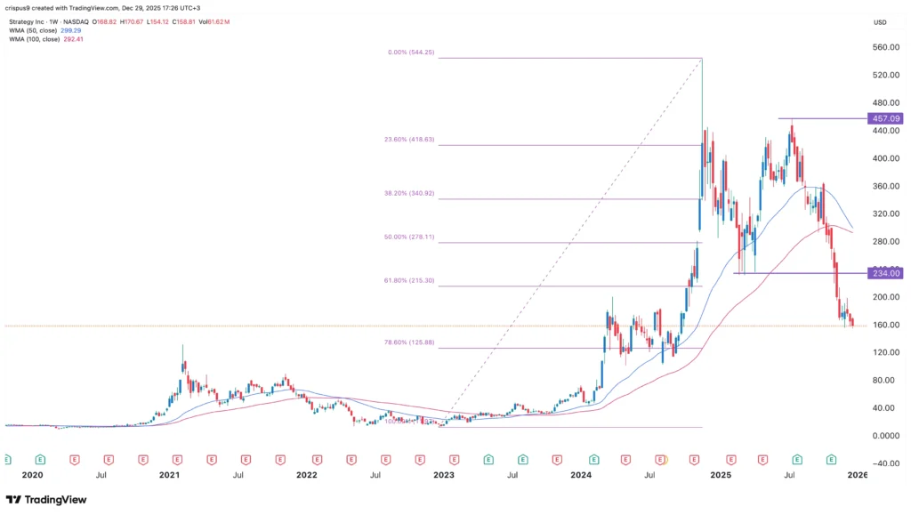 - MSTR akcijų kaina šiais metais stipriai krito.