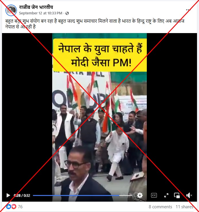 Po mirtinų kovos su korupcijos demonstracijos Nepale nuvertė Himalajų tautos vyriausybę, keli vaizdo įrašai, rodantys minias, mostinančias Indijos nacionalinę vėliavą ir išreiškiantys paramą Indijos ministrui pirmininkui Narendra Modi, buvo dalijami postuose, kurie melagingai teigia, kad protestuotojai taip pat kvietė „atkurti induistų tautą“. Iš tikrųjų visi klipai prieš protestus Nepale.
