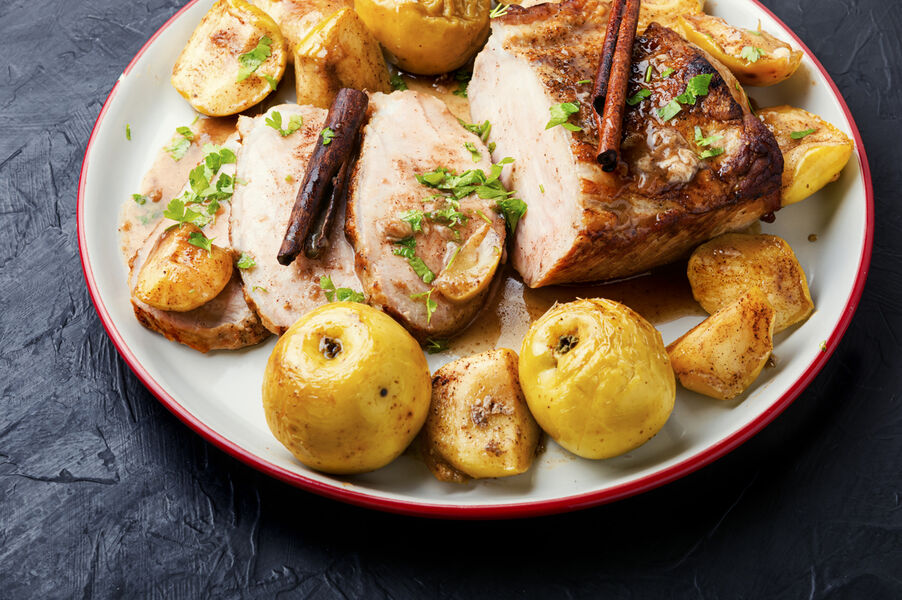 - Kepkite 45–55 minutes, kol mėsa bus visiškai iškepus, vieną kartą apversdami obuolius, svogūnus ir česnaką. Išimkite iš orkaitės, uždenkite folija. Prieš pjaustydami mėsą, palikite 10 minučių pastovėti. Patiekite su nesaldinta obuolių uogiene.