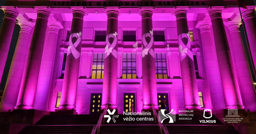 Spalio 14–16 d., nuo 21 iki 8 val., Lietuvos nacionalinės Martyno Mažvydo bibliotekos kolonos bus apšviestos rožine spalva.