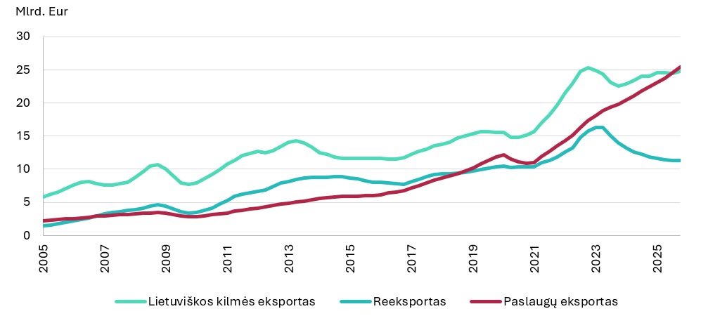 2025 m. ketvirtąjį ketvirtį eksporto metinis augimas sudarė 7,9, o visų metų prieaugis – 5,3 proc. Paslaugų eksportas per metus padidėjo daugiau nei 13 proc., lietuviškos kilmės prekių eksportas augo gerokai lėčiau (2,9 %), o reeksportas sumažėjo (4,8 %). Spartesnis paslaugų eksporto augimas lėmė struktūrinį lūžį – ši eksporto kategorija pirmą kartą tapo didžiausia. Vis dėlto šis pokytis nebuvo netikėtas. Paslaugų eksportas sparčiau už prekių eksportą didėjo jau nuo 2012 m., išskyrus laikiną nukrypimą COVID-19 pandemijos laikotarpiu. Po pandemijos ir prasidėjus rusijos karinei invazijai į Ukrainą prekių eksporto augimas iš esmės sustojo. 2025 m. pabaigoje lietuviškos kilmės prekių eksporto vertė tebebuvo mažesnė nei 2022 m., o reeksporto – beveik trečdaliu mažesnė nei 2023 m. pradžioje. Palyginkime: paslaugų eksportas visą šį laikotarpį nuosekliai didėjo ir 2025 m. pabaigoje trečdaliu viršijo 2022 m. lygį.