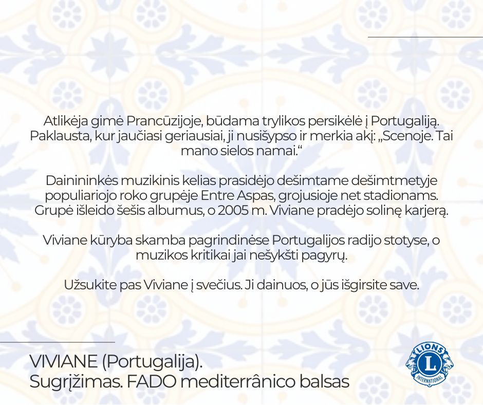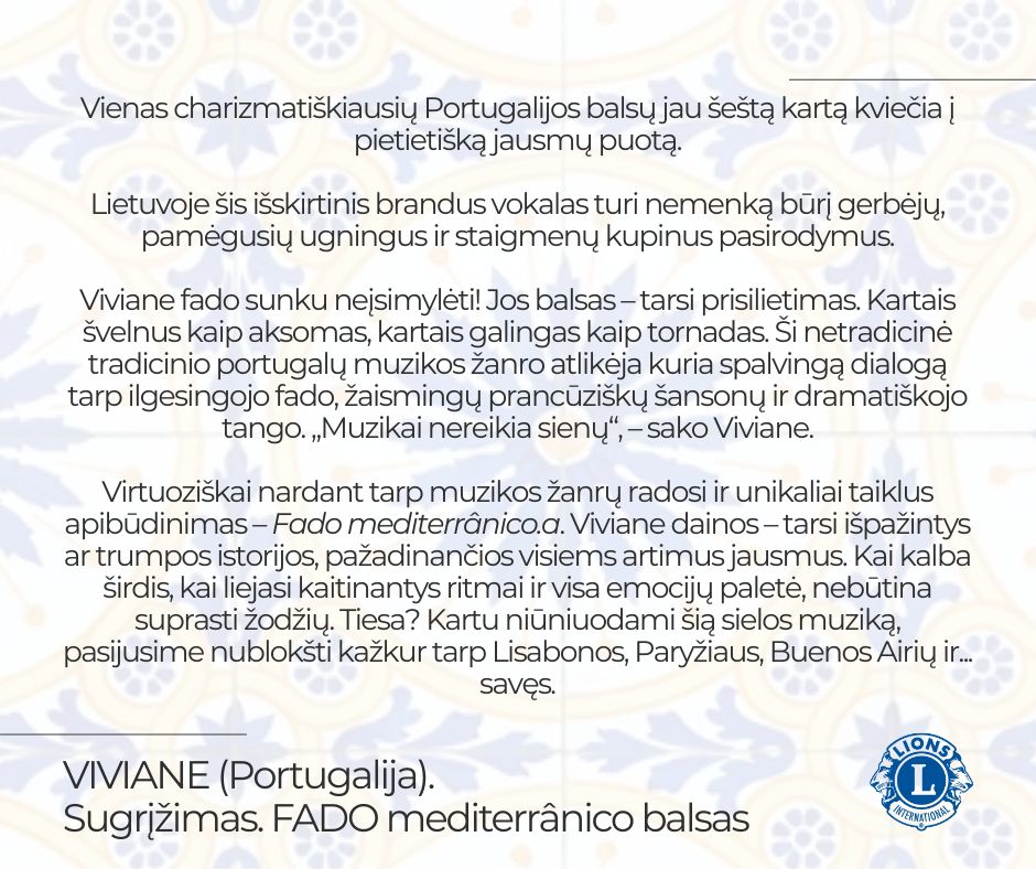 Šiaulių moterų LIONS klubas kviečia į ypatingą labdaros koncertą, kuriame skambės vienas charizmatiškiausių Portugalijos balsų – Viviane.