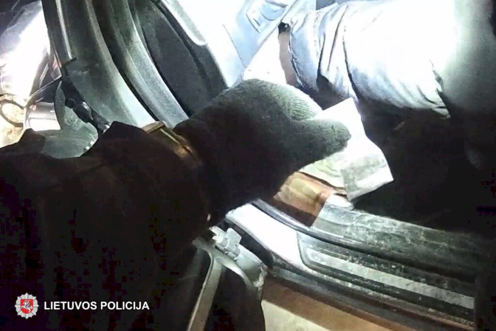 Tikrinimo metu vairuotojas bandė atsikratyti „turiniu“ – netoliese sniege aptikta medicininė kaukė, kurios viduje buvo plastikinis maišelis su baltos spalvos milteliais.