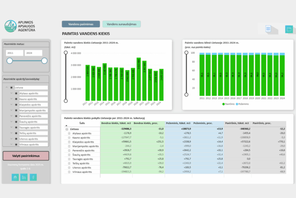 Aplinkos apsaugos agentūros (AAA) Aplinkos būklės analitikos centro specialistai parengė naują interaktyvią švieslentę, kurioje pateikiami naujausi duomenys apie vandens paėmimą ir sunaudojimą Lietuvoje.