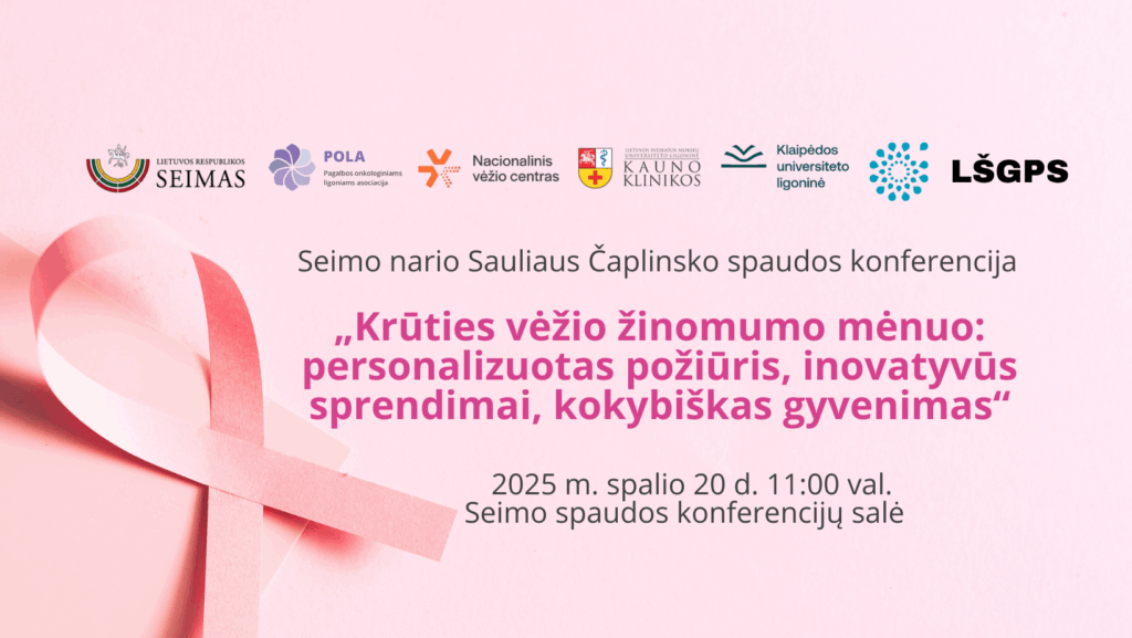 Kviečiame žiniasklaidos atstovus dalyvauti spalio 20 d. 11:00-11:30 val. Seimo Spaudos konferencijų salėje vyksiančioje spaudos konferencijoje „Krūties vėžio žinomumo mėnuo: personalizuotas požiūris, inovatyvūs sprendimai, kokybiškas gyvenimas“, kurią organizuoja Seimo narys prof. Saulius Čaplinskas drauge su Pagalbos onkologiniams ligoniams asociacija (POLA), Nacionaliniu vėžio centru, LSMU Kauno klinikomis, Klaipėdos universiteto ligonine ir Lietuvos šeimos gydytojų profesine sąjunga.