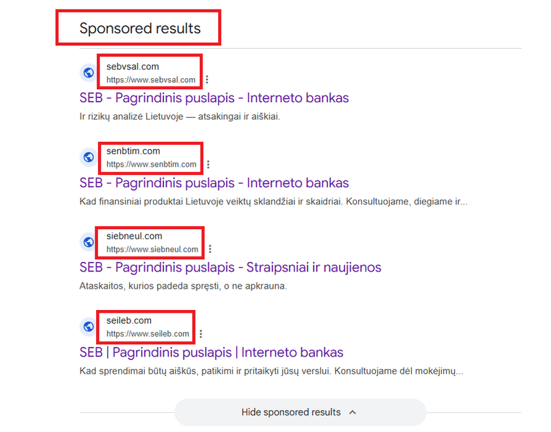„Pastebime padažnėjusius atvejus, kai sukčiai sukuria labai tikroviškai atrodančias banko ar kitų institucijų interneto svetaines, nukopijuodami originalų turinį. Net jei žmogus paieškos naršyklėje įveda banko pavadinimą, tarp paieškos rezultatų gali būti pateiktos ir sukčių reklaminės nuorodos, kurios vizualiai gali nesiskirti nuo oficialios svetainės, tačiau visuomet skirsis ir bus klaidingas pateiktas interneto svetainės adresas“, – sako SEB banko Prevencijos departamento vadovė Daiva Uosytė.