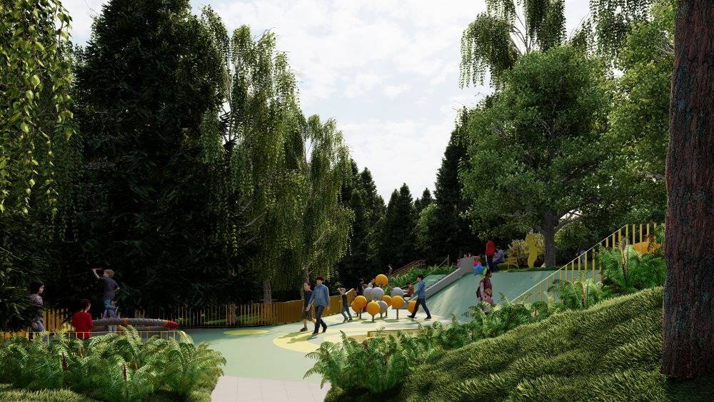 Natūralų, spygliuočių apsuptą reljefą papildys vaikų žaidimų aikštelė su ateivių motyvais, geltonos spalvos akcentai, žaisminga ateivio skulptūra. Tai ne tik džiugins vaikus, bet ir taps vizualiniu simboliu visai bendruomenei.