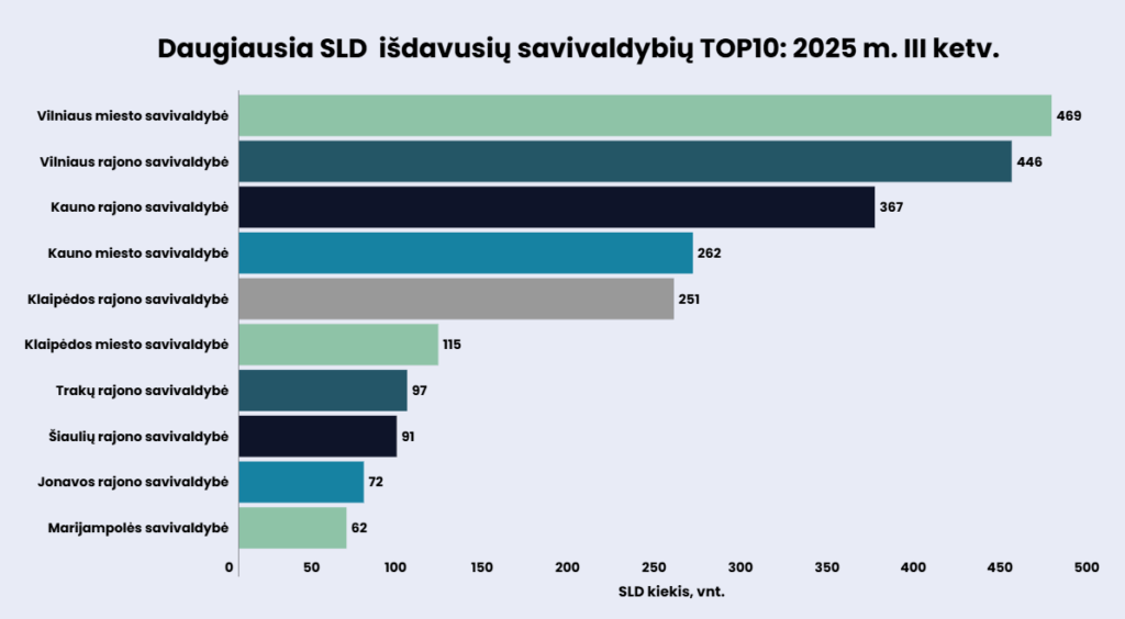 Vertinant kitose savivaldybėse išduotus didžiausius SLD kiekius, patenkančius į pirmąjį dešimtuką, ketvirtoje vietoje rikiuojasi Kauno miesto savivaldybės administracija (262 vnt.), penktoje – Klaipėdos rajono savivaldybė (251 vnt.), šeštoje – Klaipėdos miesto savivaldybė (115 vnt.), septintoje vietoje – Trakų rajono savivaldybė (97 vnt.), aštuntoje – Šiaulių rajono savivaldybė (91 vnt.), devintoje – Jonavos rajono savivaldybė (72 vnt.), o dešimtoje – Marijampolės savivaldybės administracija (62 vnt.).