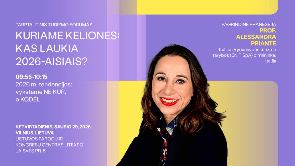 Šios ir daugybė kitų aktualių temų bus plėtojamos tarptautiniame turizmo forume „Designing Travel – What’s Next in 2026?“, kuris vyks sausio 29 dieną „Litexpo“ centre Vilniuje. Europos turizmo, politikos bei inovacijų lyderiai taip pat pasidalins, kaip dirbtinis intelektas keičia kelionių planavimą ir rinkodarą, kaip vystomos tvaresnės ir labiau personalizuotos kelionių patirtys, kokią įtaką sektoriui daro demografiniai pokyčiai bei kaip kuriami atsparesni miestų ir regionų turizmo modeliai.