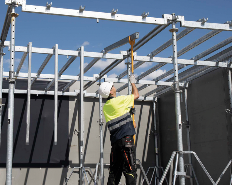 Modulinė laikančiosios dalies struktūra su iš anksto nustatytais matmenimis užtikrina nepriekaištingą tikslumą, iki minimumo sumažinant žmogiškųjų klaidų riziką. Pagrindinės klojinių sekcijos (2,00 x 2,50 m) montavimas pradedamas nuo nuleidžiamų galvų, ant kurių viena kryptimi atremiamos pagrindinės sijos. Galvų konstrukcija ir sijos su rankenomis leidžia komponentus saugiai pakabinti ir pakelti į galutinę padėtį. Stabilumas užtikrinamas prie trumpųjų pusių sumontuojant kraštines pagalbines sijas, o likusios šešios pagalbinės sijos tiesiog įkabinamos ir, naudojant specialias montavimo šakes, pakeliamos į horizontalią padėtį.
