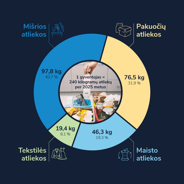 Kaip ir minėta, 2025 metais vienas Vilniaus regiono gyventojas vidutiniškai išmetė 240 kilogramų mišrių komunalinių atliekų, kuriose (vertinant visų 2025 metų ketvirčių atliekų svorių vidurkį) atliekos pasiskirstė taip: