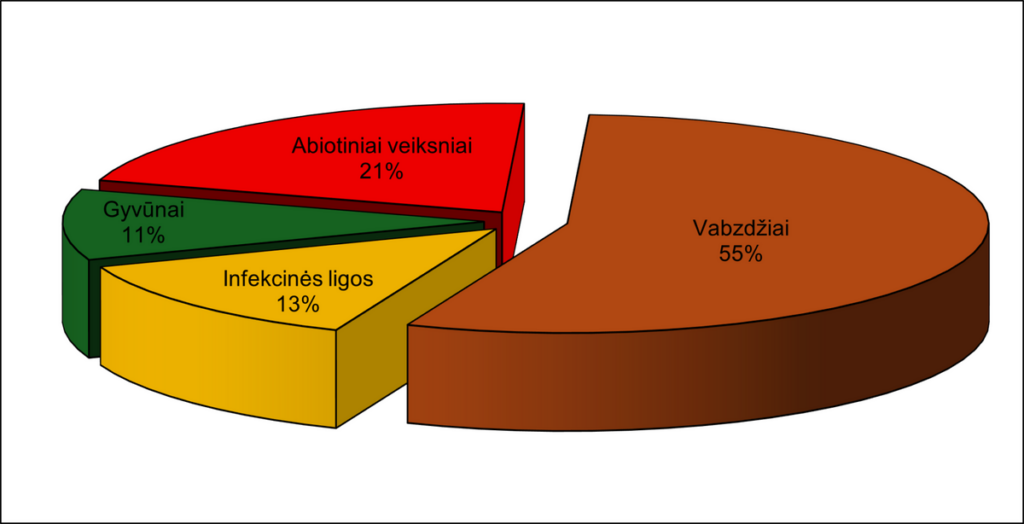 2025 metais Lietuvos valstybiniuose miškuose vabzdžių, ligų sukėlėjų, žvėrių ir abiotinių veiksnių padaryti pažeidimai užregistruoti 4447 ha plote – tai 33 procentais mažiau nei 2024 metais, kai pažeista buvo 6678 ha. Kaip ir ankstesniais metais, didžiausią dalį pažeidimų lėmė vabzdžiai, sudarę 55 procentus viso pažeisto ploto. Abiotiniai veiksniai nulėmė 21 procentą pažeidimų, miško ligos – 13 procentų, o mažiausiai žalos padarė gyvūnai – 11 procentų. Nors vabzdžių sukelti pažeidimai išliko dominuojantys, bendras pažeidimų mastas visose grupėse sumažėjo.