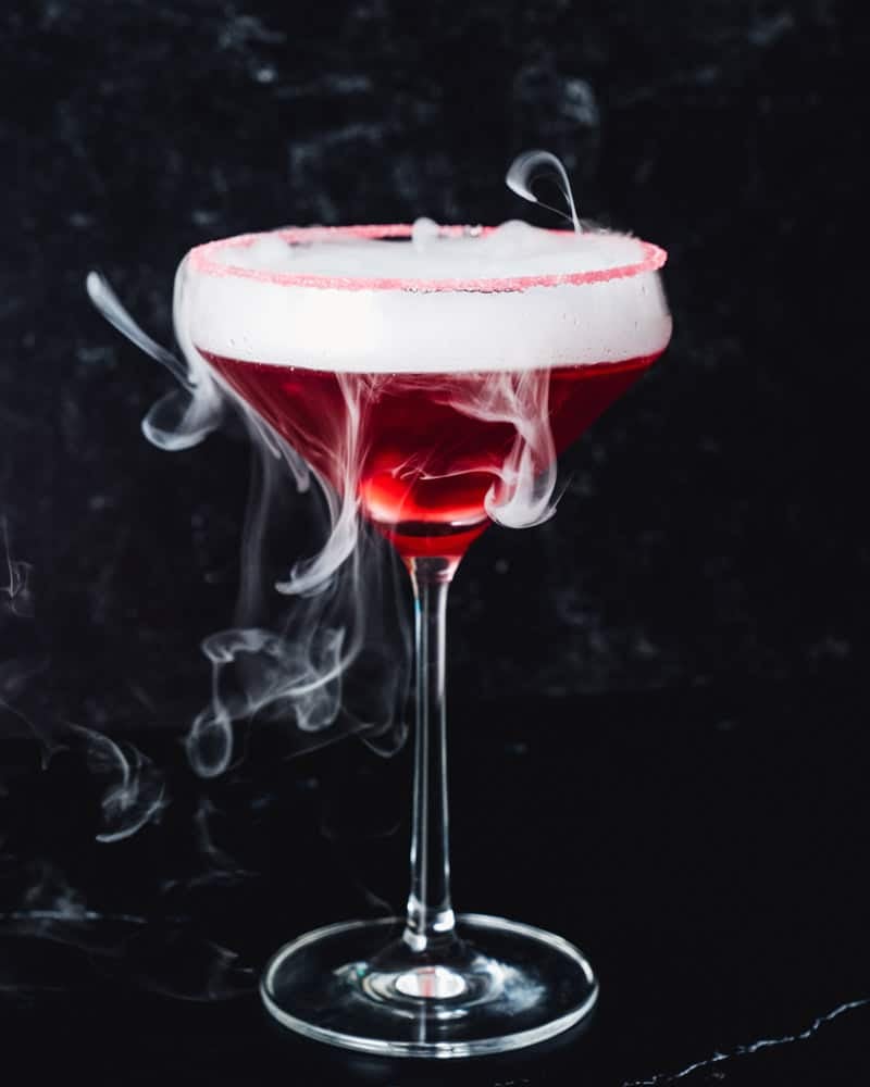 Reikia įspūdingo gėrimo su šmaikščiu vingiu? Išbandykite „Vampire’s Kiss“ kokteilį! Šis raudonojo „Blood“ gėrimas yra tiesiog uogų skonio degtinė martini, kuris maskuojasi kaip grėsmingas Helovino kokteilis.