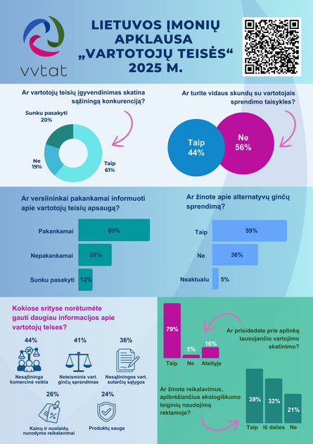 60 proc. respondentų mano, kad Lietuvos verslininkai yra pakankamai informuoti apie vartotojų teisių apsaugą (2024 m. – 56 proc.), o absoliuti dauguma – 95 proc. – žino, kur rasti informaciją vartotojų teisių apsaugos klausimais. Nepaisant to, daugiau nei trečdalis apklaustų įmonių teigia, kad švietimo reikėtų daugiau, o didžiausias informacijos poreikis fiksuojamas nesąžiningos komercinės veiklos, neteisminio ginčų sprendimo ir nesąžiningų vartojimo sutarčių sąlygų srityse.