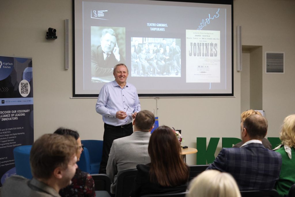 Renginys prasidėjo teatro istorijos apžvalga, tarsi trumpa kelione laiku. Pranešėjas priminė, kokius pokyčius teatras patyrė, kokie kūrėjai jį formavo ir kaip ši institucija išliko svarbi Lietuvos kultūros lauke. Jis akcentavo, kad teatras visada išlieka vertybių saugotoju – vieta, kurioje žmogiškumas pranoksta interesus, net jei kasdienybėje dažnai matome priešingas tendencijas.