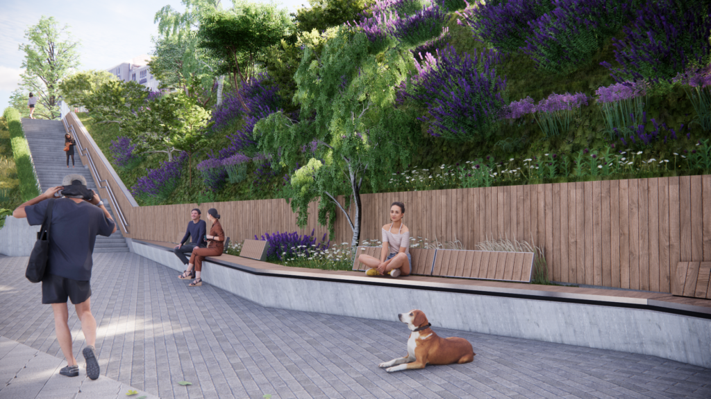 Tarp Žaliojo ir Baltojo tiltų kairėje Neries krantinėje numatomose rekreacinėse zonose miestiečiai galės atsipalaiduoti, sėdėti ant suoliukų, pasigrožėti upės vaizdais arba leisti laiką su šeima ir draugais. Gausiai apželdintas krantinės šlaitas kvies mėgautis harmoningai susiliejančia gamta ir upe. Visos viešosios erdvės detalės – želdiniai, dangos, mažosios architektūros elementai – suplanuotos taip, kad susilietų su aplinkiniu kontekstu ir jau įvykdytais krantinės atnaujinimo projektais.